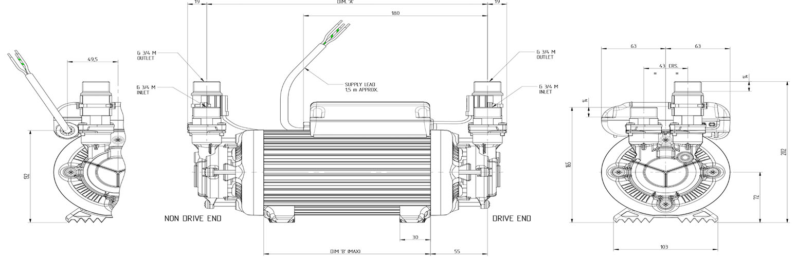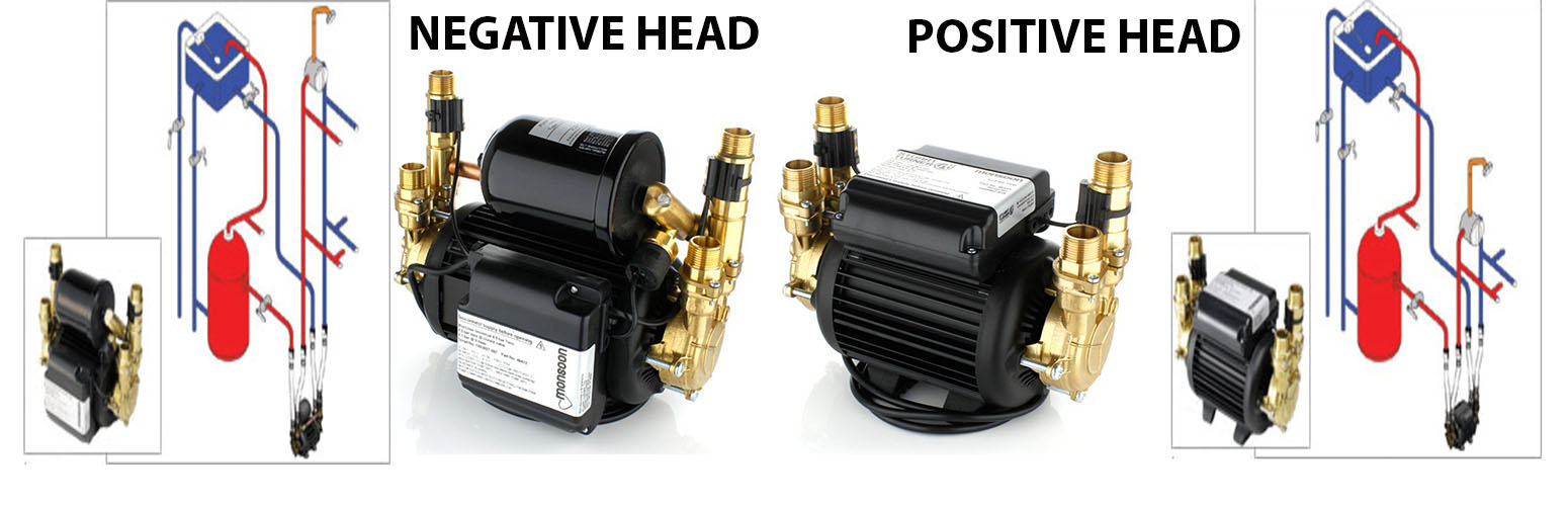 This pump is a positive head pump with 2 inlet and 2 outlet connections. It is a plastic pump and very durable and can be very quiet compared to most other shower pump models.